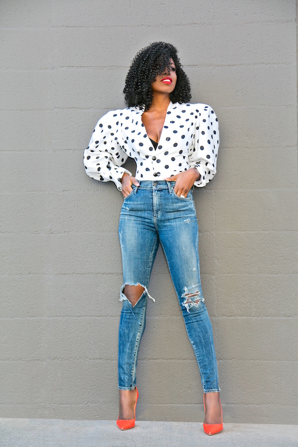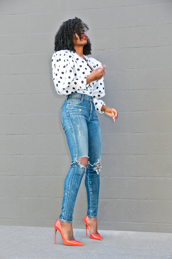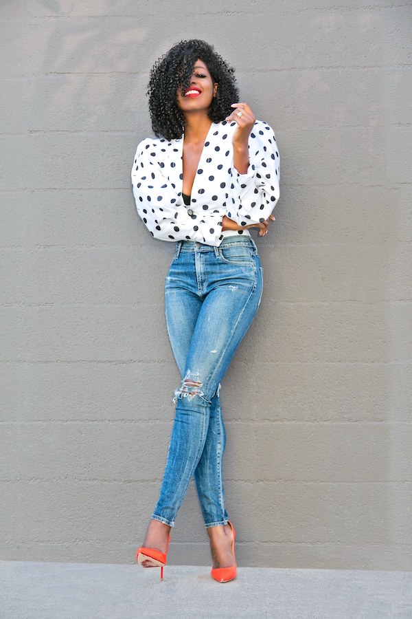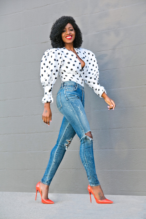 Polka Dot Puff Shoulder Blouse + High Waist Ripped Jeans