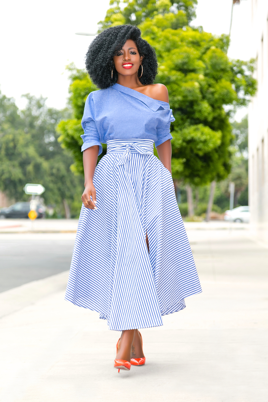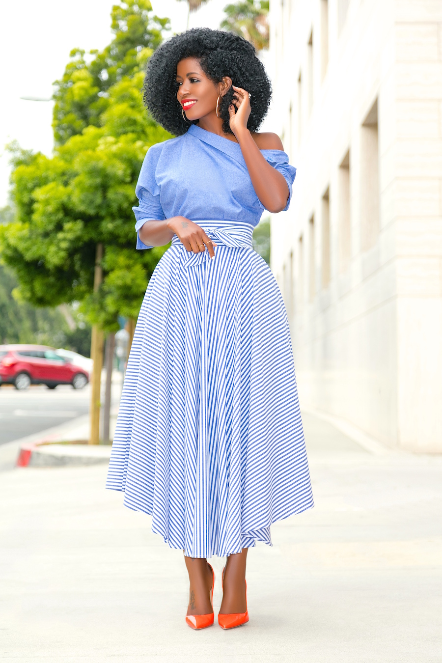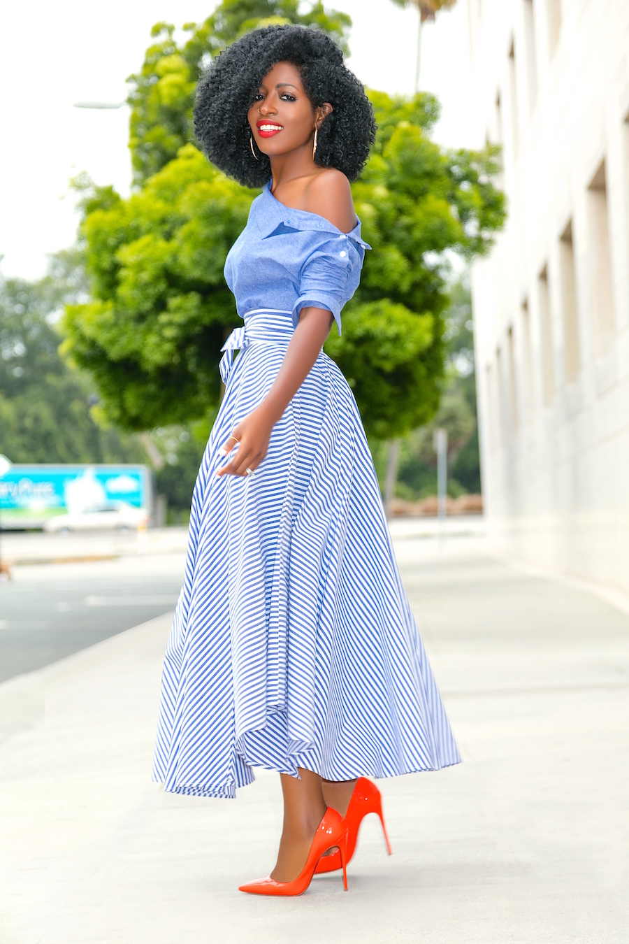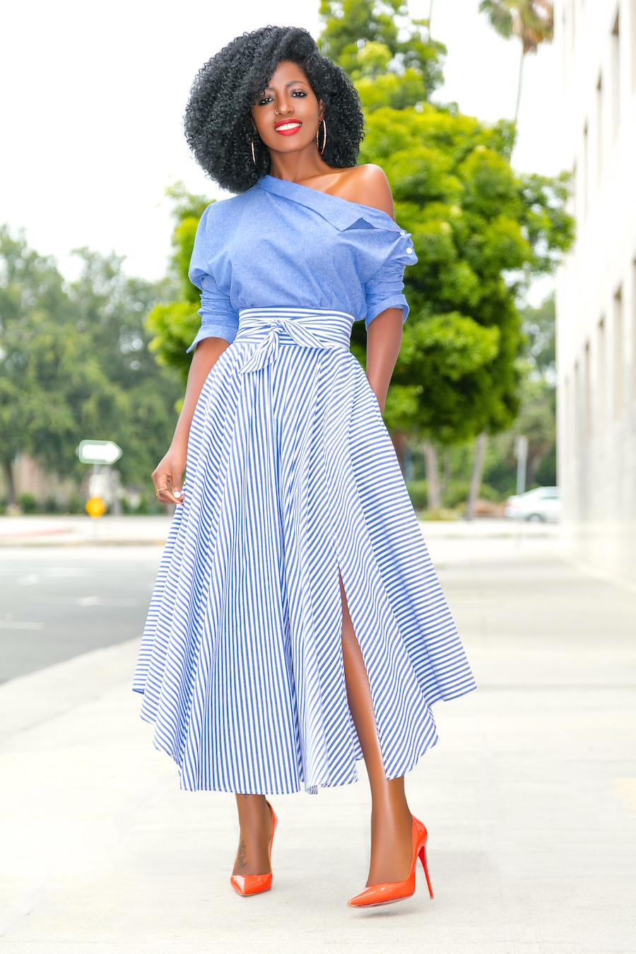 Off Shoulder Chambray Top + Belted Striped Midi Skirt