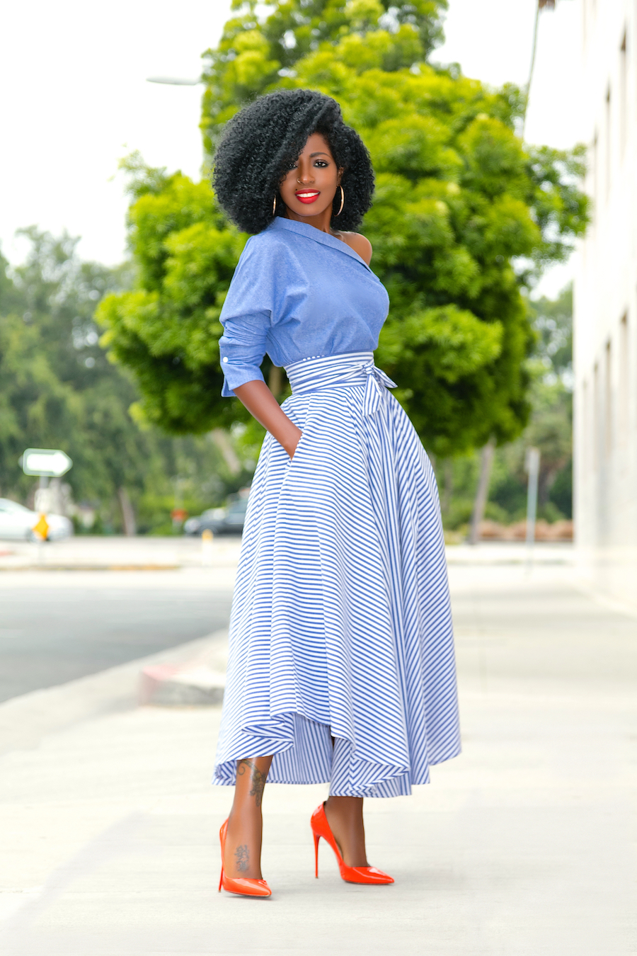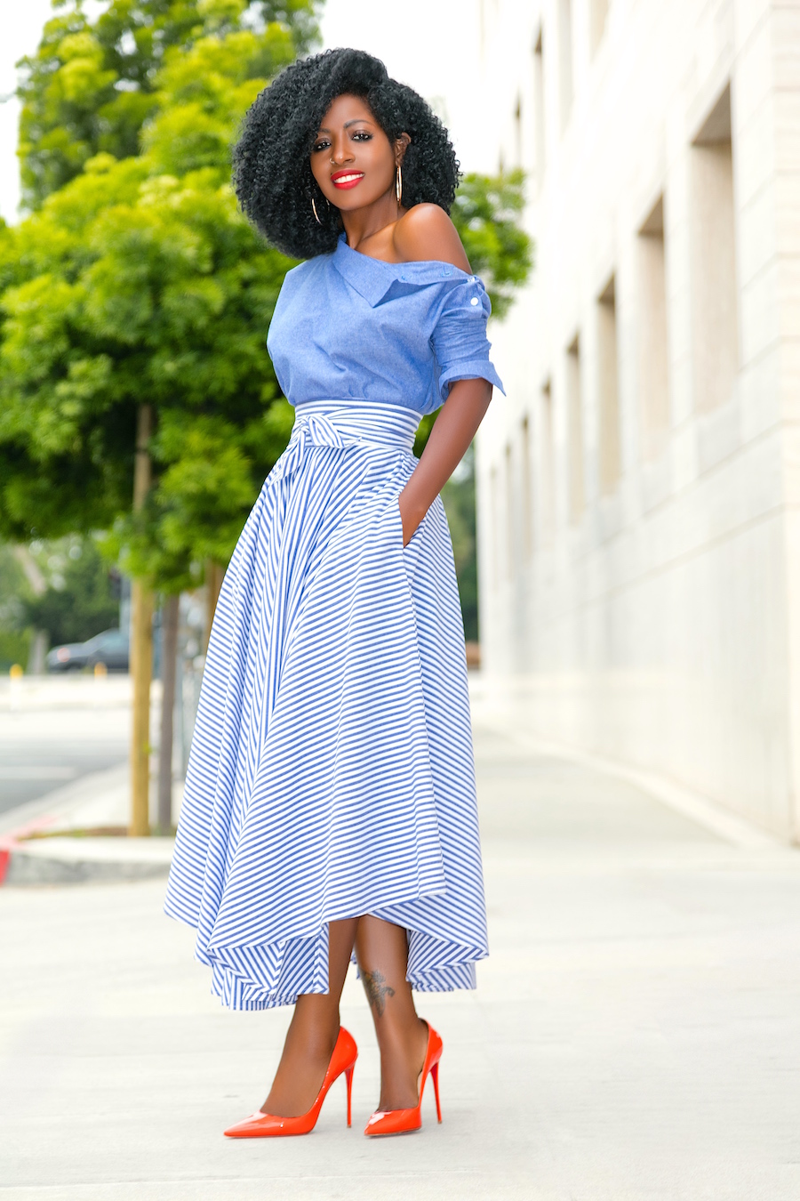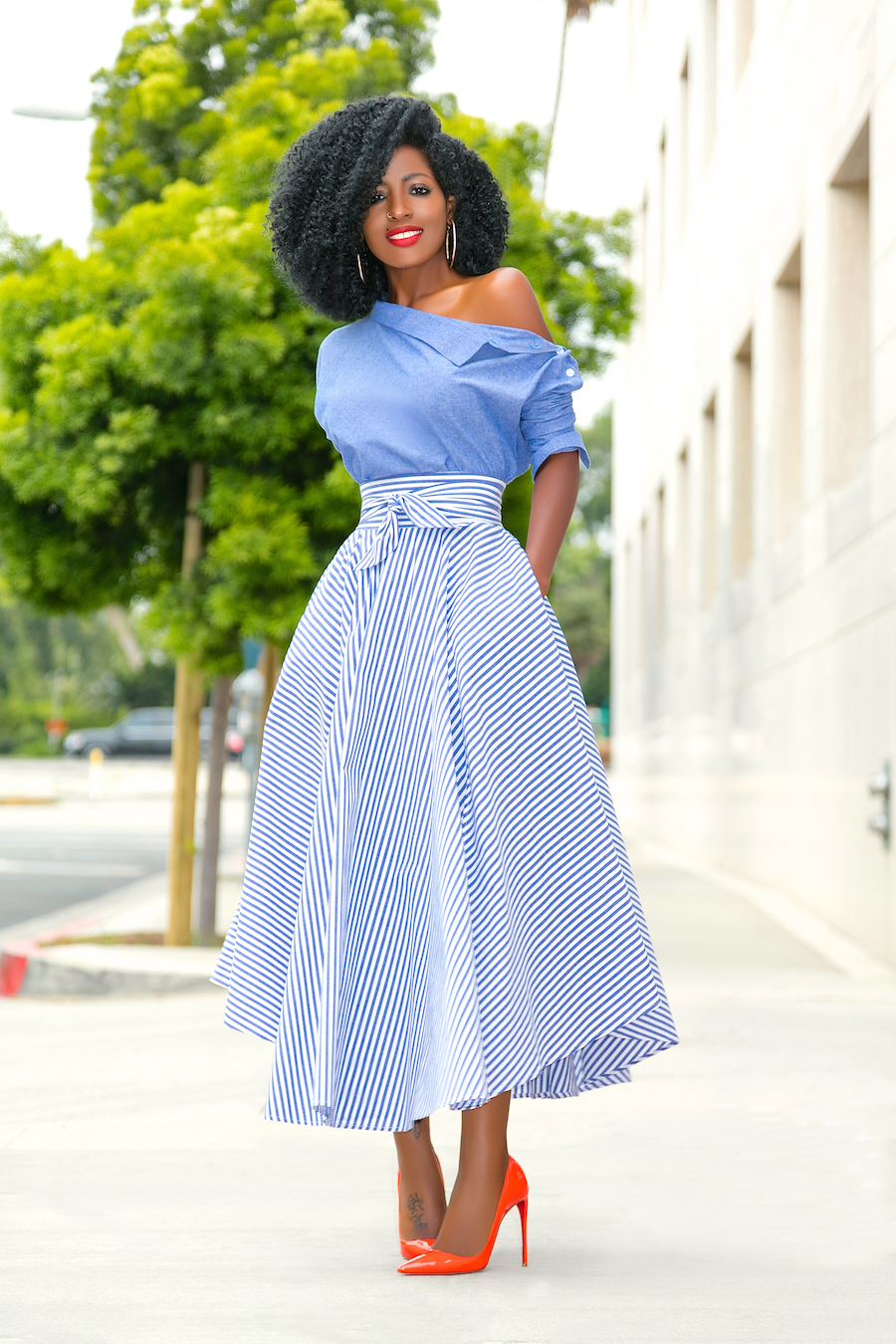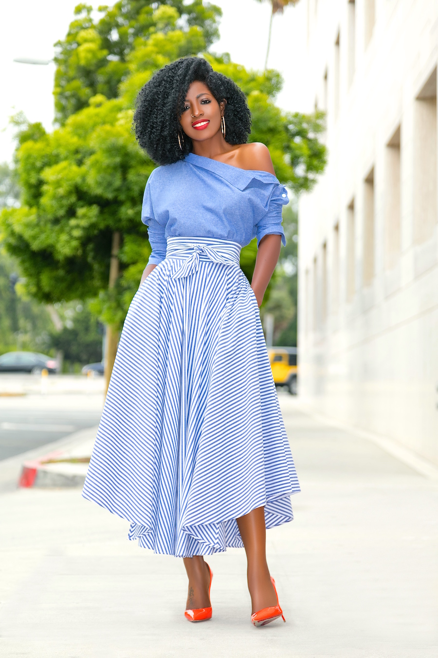 Off Shoulder Chambray Top + Belted Striped Midi Skirt
