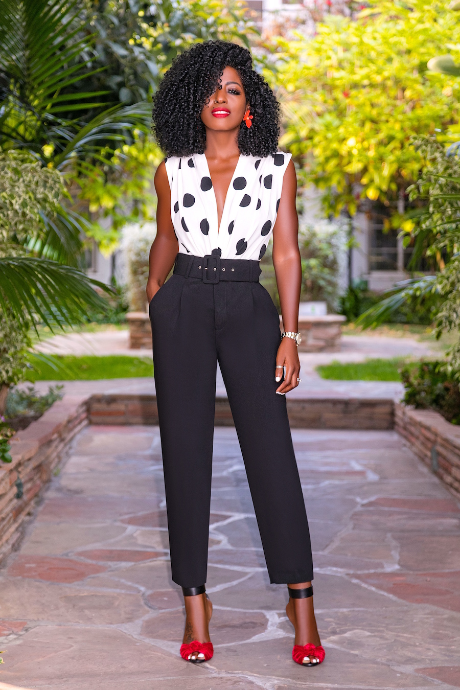 Draped Bodysuit + Belted High Waist Pants August 2, 2018 Outfit Details: Top: Zara (Same in white – the dotted piece is old) | Pants: Zara (old) | Shoes: Tom Ford. Enjoy and have a blessed one. xo Tags belted pants draped bodysuit FKSP Folake H. folake huntoon Folake Kuye Huntoon get the look high waist pants pegged pants polka dot polka dot bodysuit style pantry summer 2018 outfits